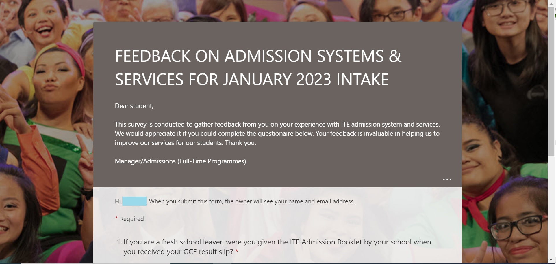 Login to the survey website with your ITE email and myITE password. Ref: https://for.edu.sg/admissionsurvey