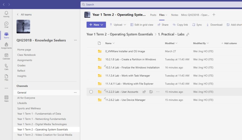 The storage access of the video recordings is actually in your Class’ Teams channel “QH2301B – Knowledge Seekers” -> Under Sub-Channel “Year 1 Term 2 – Operating System Essentials” -> Select “Files” tab -> “1. Practical – Labs” folder.
