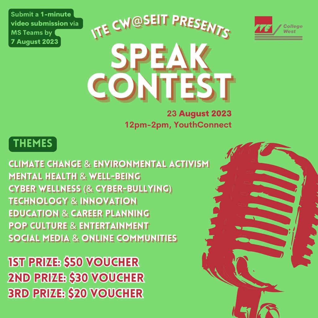 Dear class, School of Electronics & Info-comm Technology (SEIT) – College West is running its SPEAK contest tomorrow (23rd August 2023).