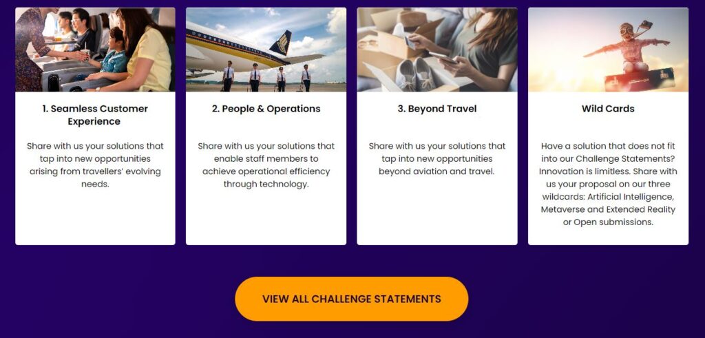Four key themes, eleven challenge statements and three wildcard categories were identified. Take a look and think, do you have a proposed design and solution to solve this? Ref: https://appchallenge.singaporeair.com/en/challenges/startup-2023/pages/challenge-statements?lang=en